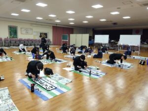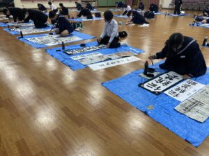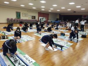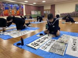 書初練習(12/05) 2025年12月5日 学校生活 国語科では、書初の練習をしています。1年生は「伝統芸能」と楷書で、2年生は「文学の地」、3年生は「初志貫徹」とそれぞれ行書で書きます。中心やバランス、筆脈など、手本をよく見ながら練習しました。