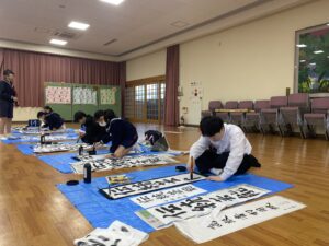 書初練習(12/05) 2025年12月5日 学校生活 国語科では、書初の練習をしています。1年生は「伝統芸能」と楷書で、2年生は「文学の地」、3年生は「初志貫徹」とそれぞれ行書で書きます。中心やバランス、筆脈など、手本をよく見ながら練習しました。 実際に、毛筆で書く前に、中心や字形などについても学習しました。その際使用した水書板は「なんとエナジー教育応援基金」を活用しました。ご支援くださりありがとうございます。