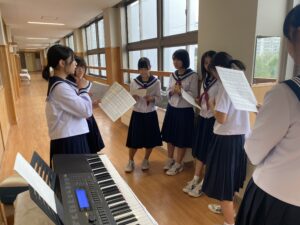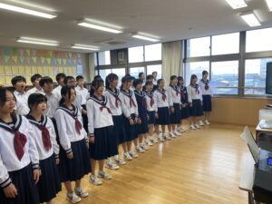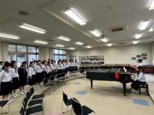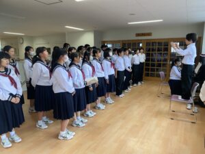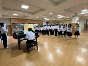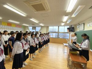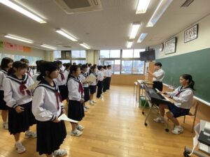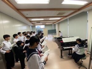 合唱練習♪(10/20) 2025年10月20日 学校生活 合唱コンクールに向けて各学級で練習を行っています。音程を再確認している学級や強弱等の表現を考えている学級など、それぞれ工夫して練習を進めています。合唱コンクールは、10月25日(土)の学習発表会の中で行います。