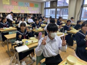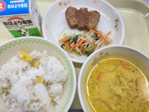 ハロウィン献立🎃(10/31) 2025年10月31日 学校生活 今日の給食は、ハロウィン献立でした。イベントに合わせて、おいしくいただけるよう工夫してくださっています。かぼちゃ型ハンバーグやパンプキンポタージュなど、味わっていただきました。