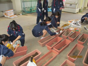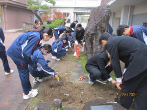 チューリップ球根植え🌷(11/26) 2025年11月27日 学校生活 生徒活動の時間に、環境美化委員会とボランティア委員会でチューリップの球根を植えました。色や向きを考えて植えました。来年の春、美しい花を咲かせてくれることを楽しみにしています。