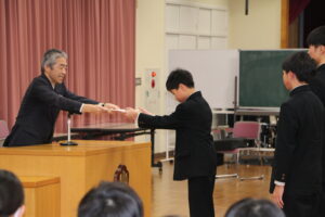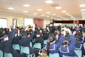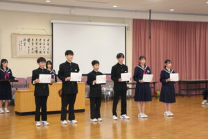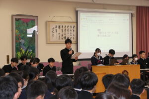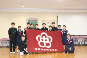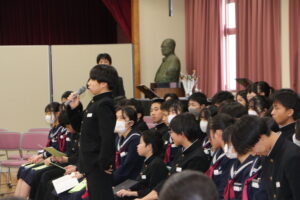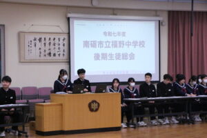 後期生徒総会・生徒会役員認証式(01/29) 2026年1月29日 学校生活 後期委員会の活動報告や「福中スタンダード」定着に向けて全校で話し合いをしました。また、後期生徒会役員から来年度前期生徒会役員への引継ぎも行いました。