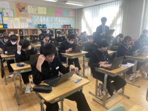 2年生は、来年度の全国学力・学習状況調査に向けて、タブレット端末で調査を行う英語の事前検証をしました。話すことや書くことの問題を少し解いてみました。
