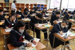 3年生 美術(4/27) 2026年4月27日 学校生活, 未分類 3年生の美術の授業です。『自分が主役の映画をつくろう』という学習課題のもと、①今の自分、②がんばる自分、③悩みや決断の場面、④夢(目標)を叶えた自分、の4つの場面をもとにストーリーを考えています。生徒たちは、友達や先生と相談しながら、楽しそうに作品づくりに取り組んでいました。