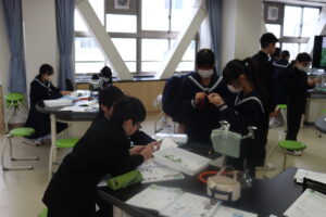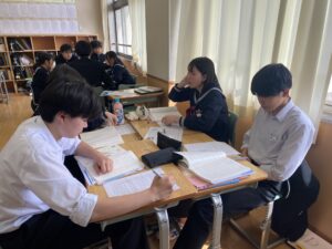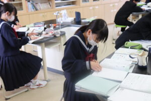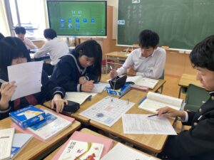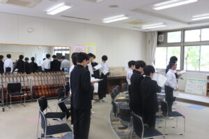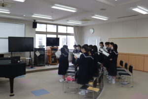2年生 音楽(4/28) 2026年4月28日 学校生活 2年生の音楽の授業では、『明日に向けて』という合唱曲の練習に取り組んでいます。パートごとに、音程やリズムを確かめながら、一人一人が真剣に練習していました。