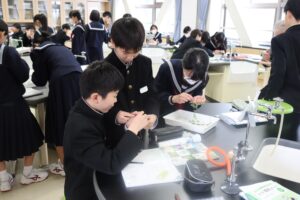 1年生 理科(4/28) 2026年4月28日 学校生活 1年生の理科の授業では、カラスノエンドウのめしべをスケッチする学習を行いました。生徒たちは、ピンセットを使ってめしべを丁寧に取り出して採取していました。採取しためしべはノートに貼り付け、スケッチの準備を進めていました。