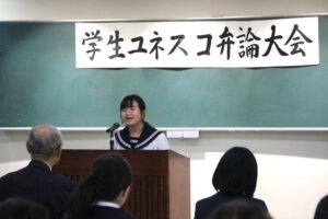 ユネスコ弁論大会(09/30) 2025年9月30日 学校生活 9月27日(土)に行われた富山県ユネスコ協会主催の「第73回学生ユネスコ弁論大会」に2年生が出場しました。「平和と教育」と題し、自分の体験を交えながら堂々と意見を述べました。