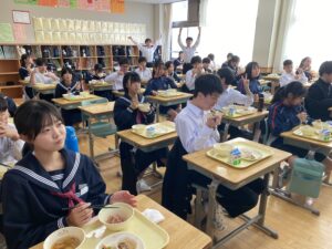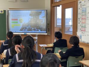 平成28年12月1日、城端曳山祭が「山・鉾・屋台行事」の一つとしてユネスコ無形文化遺産に登録されました。今日の給食は、それをイメージした曳山献立(「曳山にぎわいあえ」「大車輪焼き」「赤飯」「紅白ちょうちん汁」)でした。 城端小学校の児童が作成した「世界遺産献立 城端曳山献立」の動画を視聴しながらいただきました。