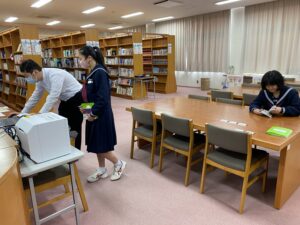 ボランティアで落ち葉を掃いている生徒、玄関ホールでピアノを弾いている生徒、校長先生のメッセージを読んで回答している生徒、図書室で本を読んでいる生徒、体育館で体を動かしている生徒……。昼休みを有効に活用している姿が見られます。