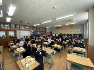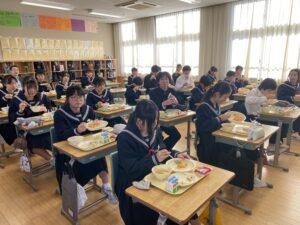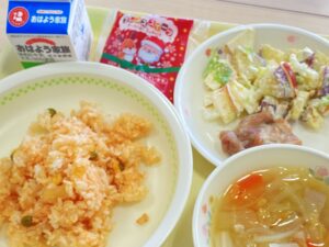 本日の給食は、クリスマスを感じさせるメニューでした。季節を感じながら、おいしくいただきました。