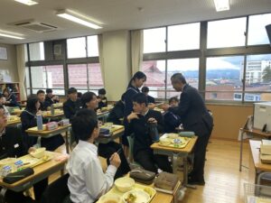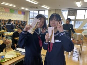給食の時間には、「今年の漢字」の正解者に校長先生からプレゼントがありました。応募は232票あり、16名の生徒が正解しました。