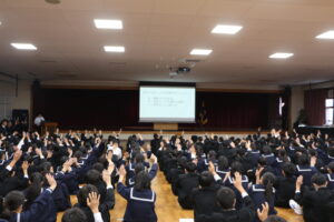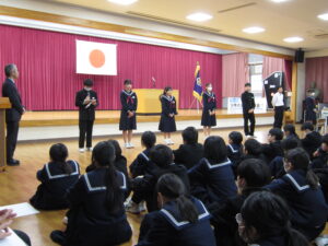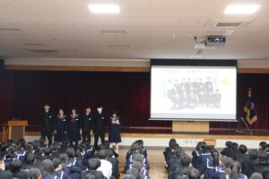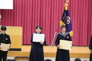 本日、2学期の最終日でした。大掃除の後、生徒集会や受賞披露を行いました。終業式の学校長式辞の中で「2学期頑張ったことや3学期に向けての抱負などを、自分の思いを述べてくれる人はいませんか」との校長先生の問いかけに、7名の生徒が全校の生徒の前で発表しました。