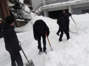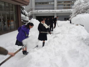先日からの大雪で、前庭にもたくさん雪が積もりました。朝からたくさんの生徒がボランティアで除雪をしてくれました。